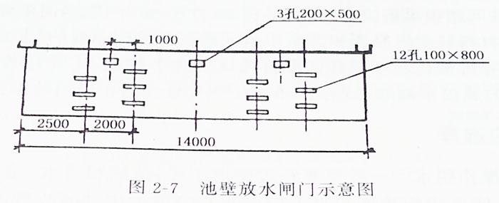 進(jìn)灰水渠道斷面為50cm×70cm,總長200m。池壁放水閘門(圖2-7)由標(biāo)高0.3m開始,每隔0.2m設(shè)兩個0.1m×0.8m的排水孔,及標(biāo)高0.5m、0.7m、0.9m、1.1m和1.3m處各設(shè)兩個。標(biāo)高1.5m處設(shè)三個0.2m×0.5m的排水孔。排水管道190m,井點抽水設(shè)備兩套。